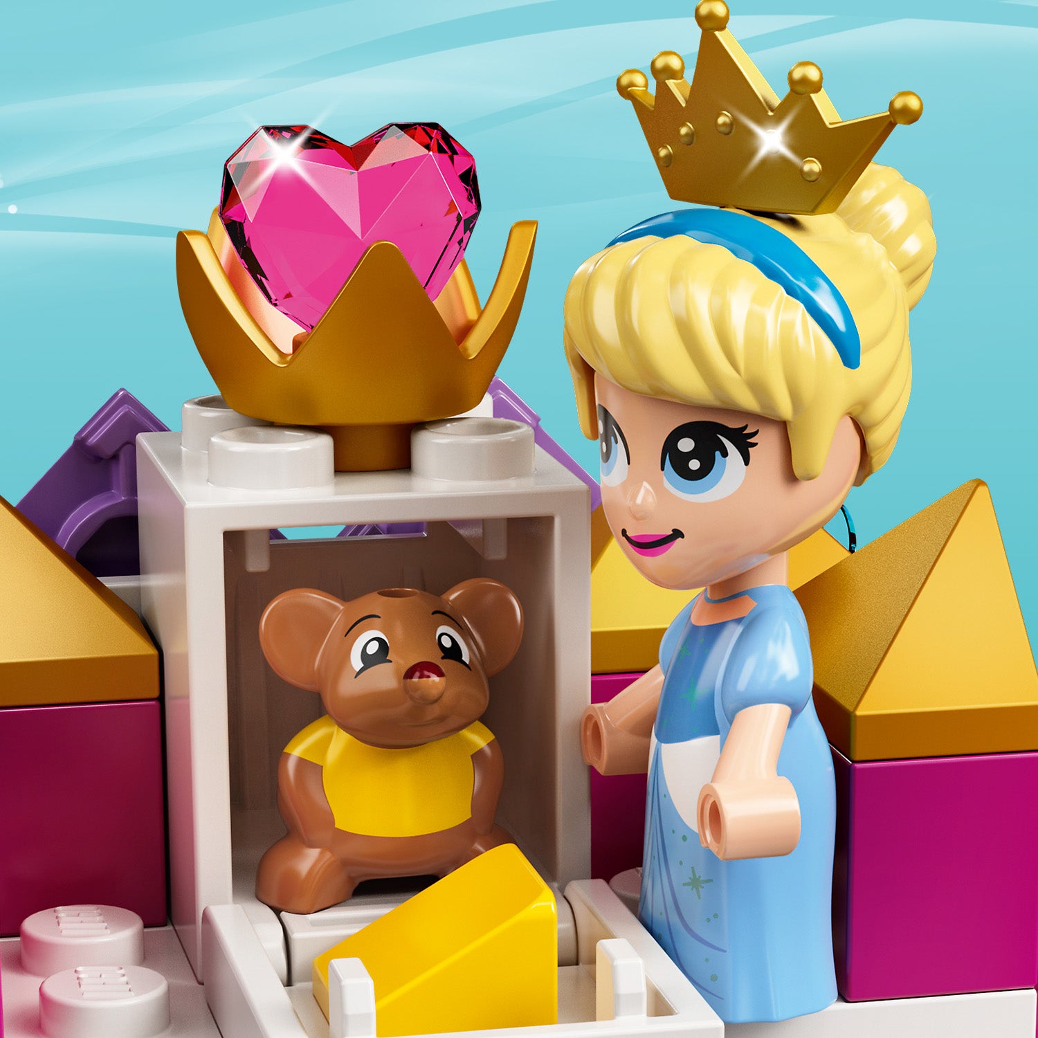 - 4 beloved micro-characters – Disney’s Cinderella, Tiana, Belle and Ariel – are ready for adventures in this buildable toy, together with Gus, Lumiere, a dolphin and frog LEGO® figures.