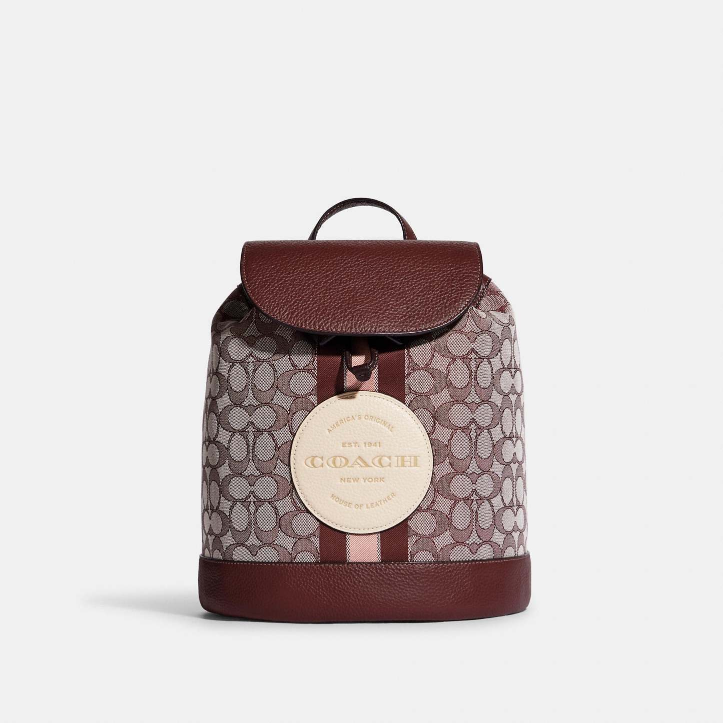 Signature jacquard and refined pebble leather Inside zip and multifunction pockets Drawstring and snap closures fabric lining Top handle with 3 drop Adjustable shoulder straps 10 1/4 (L) x 12 (H) x 6 1/4 (W) This piece is crafted of our Signature jacquard made from a blend of organic cotton and recycled polyester Style No. CE601 | Outlet Dempsey Drawstring Backpack In Signature Jacquard With Stripe And Patch - Red