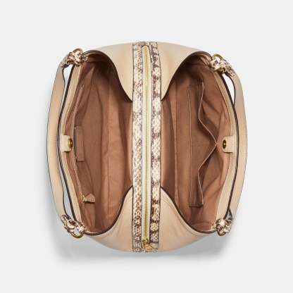 Signature coated canvas refined leather and snake-embossed leather Inside zip cell phone and multifunction pockets Center zip compartment Snap closure fabric lining Handles with 9 1/2 drop Outside zip pocket 12 1/2 (L) x 10 3/4 (H) x 5 3/4 (W) Style No. C7332 | Outlet Kristy Shoulder Bag In Colorblock Signature Canvas - Multi
