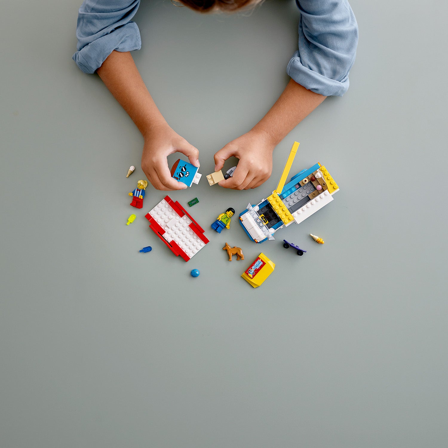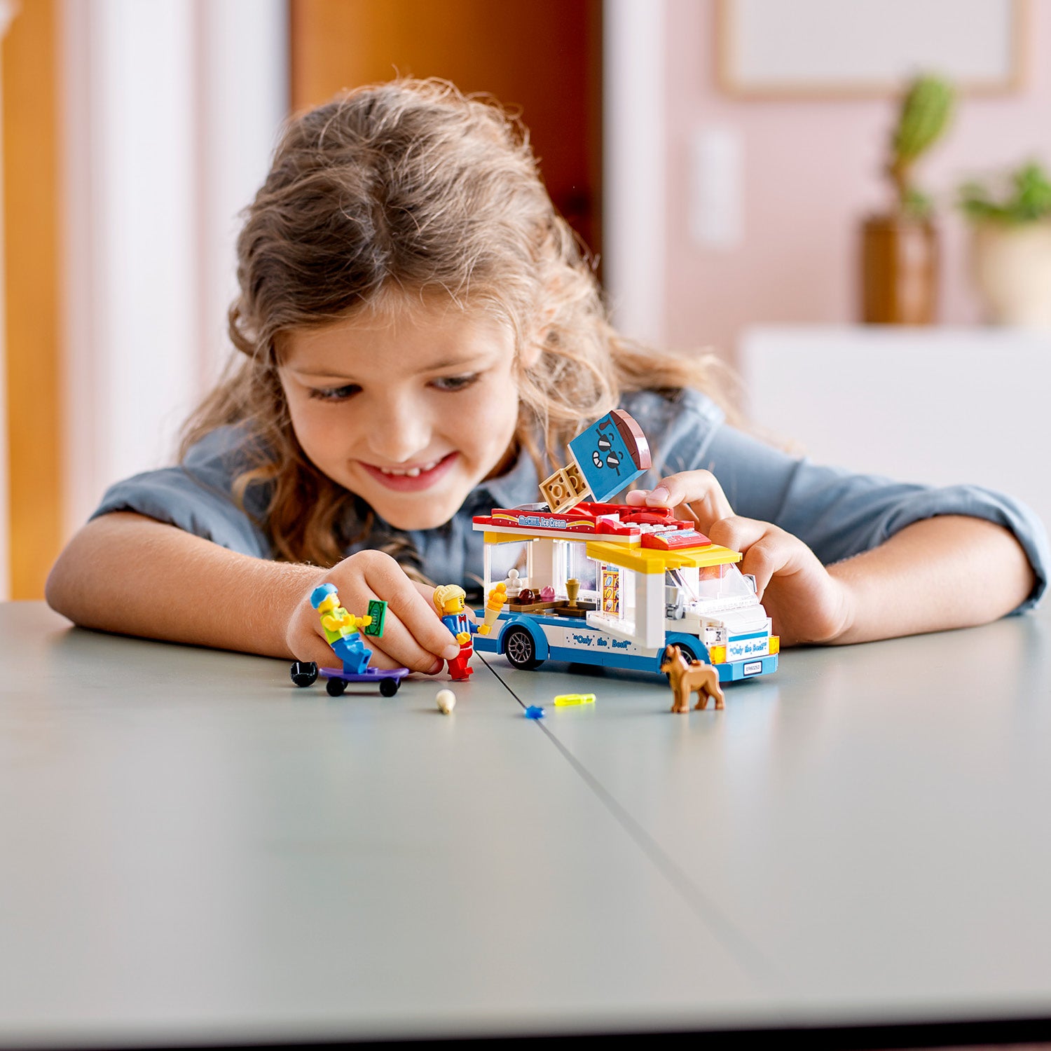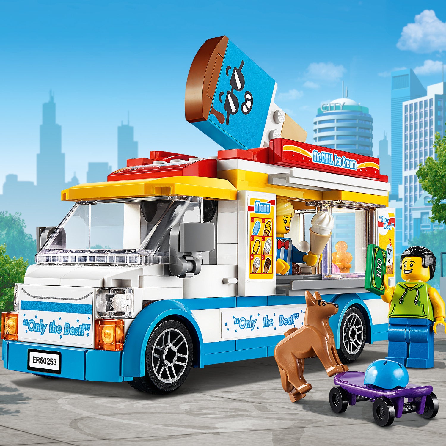 - Building set for kids featuring a brightly coloured ice-cream truck with ice-cream lady and skateboarder minifigures, plus a dog figure. Perfect for imaginative, independent play.