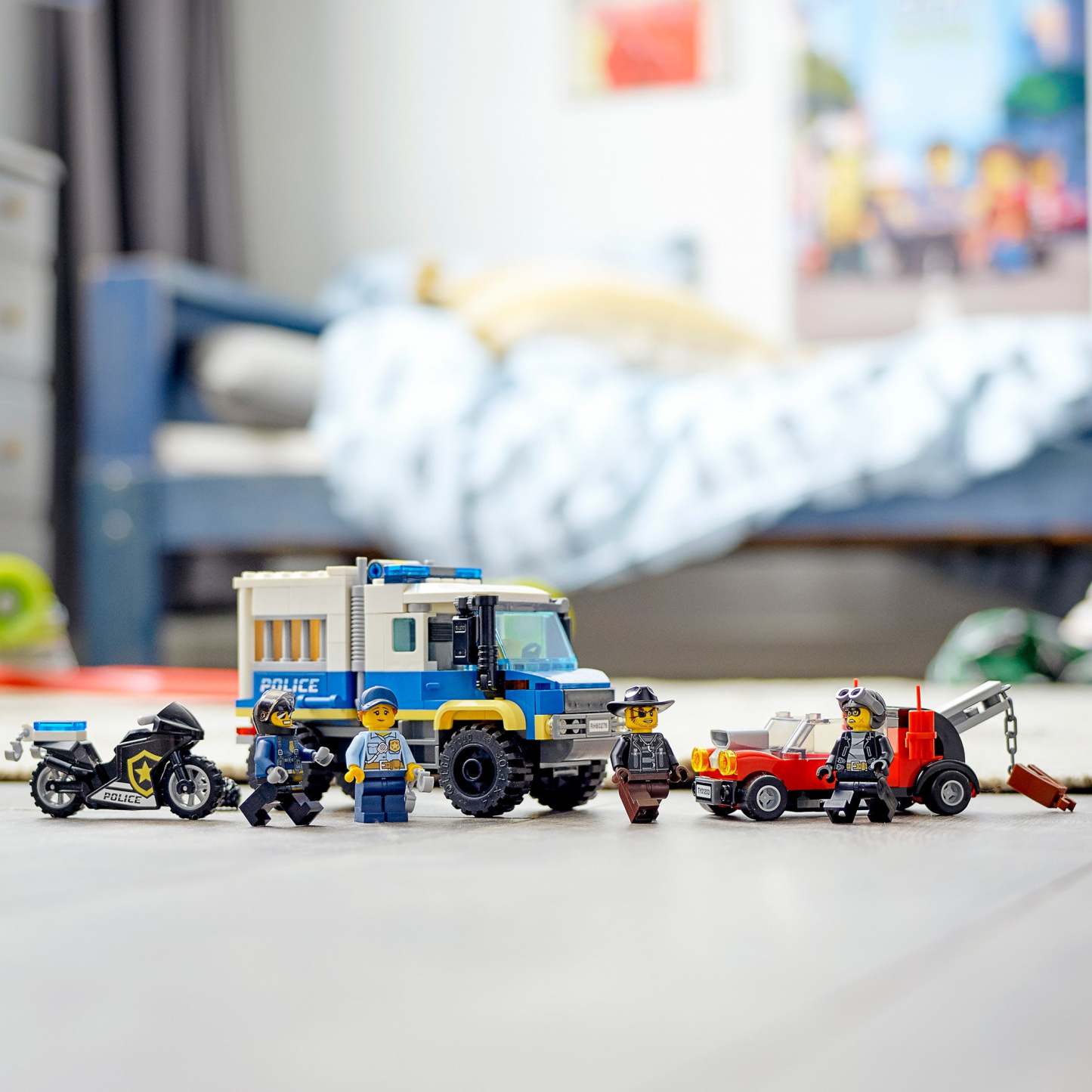 - Kids can explode the prison cell free from the truck, hook it up to the crooks souped-up tow truck, and give chase with the cool police motorcycle.